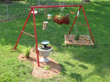 How about using the swing set as a bird feeding station? It looked a little junky, all faded with the feeders hanging off it.