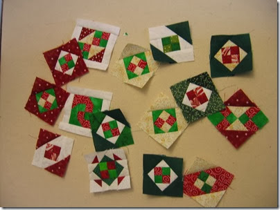 There are more in progress too. These little blocks are just waiting for their borders, then I’ll sandwich them with a square of muslin and a square of batting. I can write on the muslin to turn them into gift tags or to record the year they were made, or both. And just so you know, they are not very time consuming, so I still had time to do groceries and laundry the past few days. I may be obsessed but I still like eating and clean clothes!