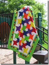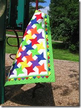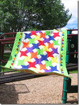 ReplyDeleteThis is such a bright and happy quilt! I love that you photographed it in a playground. Perfect. I also love the spirals in the star centres. I am feeling that same tug-of-war between my basement sewing corner and the beautiful outside warm sunny days!