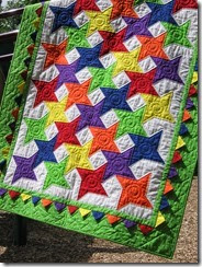 The two pictures below at least show off the quilting detail. In the border I just echoed the prairie points using my walking foot. I used the walking foot for the outline quilting inside and outside all the stars as well. In an earlier post I pondered quilting the alphabet in the stars, but in the end I decided that the colors provided enough variety and I needed something common in all the stars to calm things down, so I went with a simple free-motion swirl in each star.